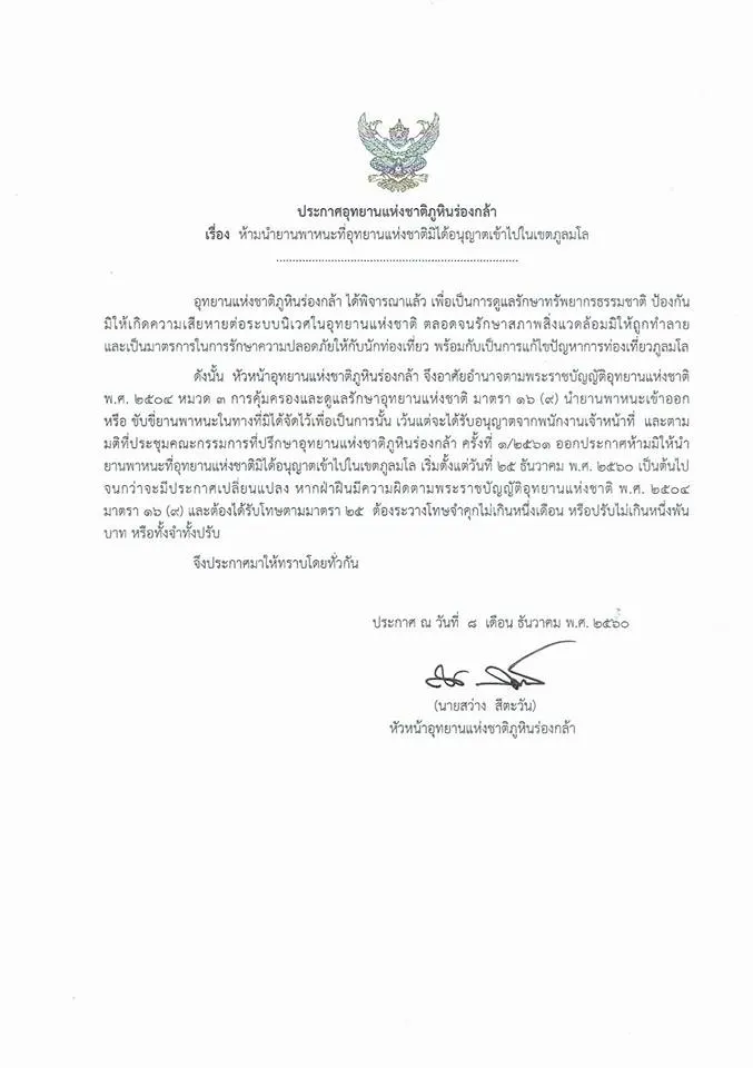 เฟซบุ๊ก ภูหินร่องกล้า ดินแดนประวัติศาสตร์ มหัศจรรย์ธรรมชาติ โพสท์ประประกาศ เรื่อง ห้ามนำยานพานะที่อุทยานแห่งชาติมิได้อนุญาตเข้าไปในเขตภูลมโล เพื่อเป็นการดูแลรักษาไม่ให้เกิดความเสียหายของระบบเนิวศในอุทยาน นอกจากนี้ยังเป็นมาตรการในการรักษาความปลอดภัยแก่นักท่องเที่ยวอีกด้วย