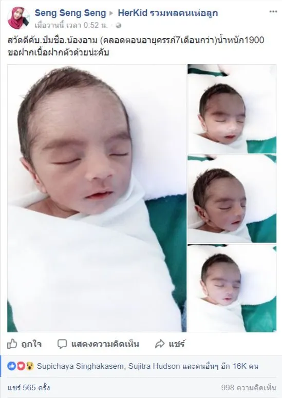 ซึ่งในโพสต์ของคุณ “Seng Seng Seng” ได้ระบุข้อความว่า “สวัดดีคับ.ป๋มชื่อ.น้องอาม (คลอดตอนอายุครรภ์ 7 เดือนกว่า) นํ้าหนัก 1900 ขอฝากเนื้อฝากตัวด้วยน่ะคับ” โพสต์ดังกล่าวได้มีภาพน้องอาม 4 ภาพ ทำเอาผู้คนที่ได้เห็นนั้นหลงรัก หนูน้อยรายนี้กันเป็นแถวๆ ความคิดเห็นส่วนใหญ่ บอกว่าน้องอามมีใบหน้าที่หล่อและดูดีแต่เด็กเลย