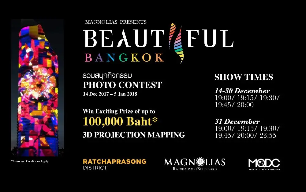 ร่วมสนุกส่งภาพถ่ายในงาน Beautiful Bangkok by Magnolias @Ratchaprasong กับการแสดงแสง สี 3 มิติ (3D projection mapping) บนตึกสูง 60 ชั้น เป็นครั้งแรกในประเทศไทย ณ โครงการ แมกโนเลียส์ ราชดำริ บูเลอวาร์ด (MRB) ชิงรางวัลมูลค่าสูงสุด 100,000 บาท