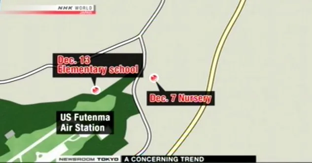 เกิดเหตุไม่คาดฝันเมื่อหน้าต่างบานหนึ่งของเฮลิคอปเตอร์ ซีเอช-53 อี ของทหารสหรัฐตกลงไปที่สนามกีฬาของโรงเรียนประถมศึกษาแห่งหนึ่ง ซึ่งตั้งอยู่ใกล้กับฐานทัพอากาศฟุเตนมะ ซึ่งเป็นฐานทัพของนาวิกโยธินสหรัฐ สำนักข่าวเกียวโดรายงานว่าจากเหตุครั้งนี้มีนักเรียนชายคนหนึ่งได้รับบาดเจ็บเล็กน้อย