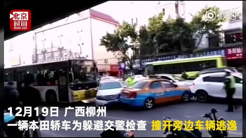 19 ธ.ค. ที่ผ่านมา ขณะที่ตำรวจจราจรเมืองหลิ่วโจว มณฑลกว่างซี กำลังพยายามสกัดดั้นรถเก๋ง 4 ประตูสีขาวคันหนึ่งเพื่อตรวจค้น ทว่าคนขับรถคันดังกล่าวไม่ให้ความร่วมมือ ล็อคประตูรถยนต์ทุกด้าน ตำรวจหลายนายทั้งพยายามดึงที่จับประตูไว้และทุบกระจกเพื่อให้รถหยุด แต่คนขับกลับพยายามพุ่งเข้าชนรถแท็กซี่ที่จอดอยู่เลนข้างๆ หลายต่อหลายครั้งเพื่อหาทางหนีออกไปจากที่เกิดเหตุ โดยไม่ใส่ใจว่าจะสร้างความเสียหายให้รถยนต์คันอื่นๆ แต่อย่างใด