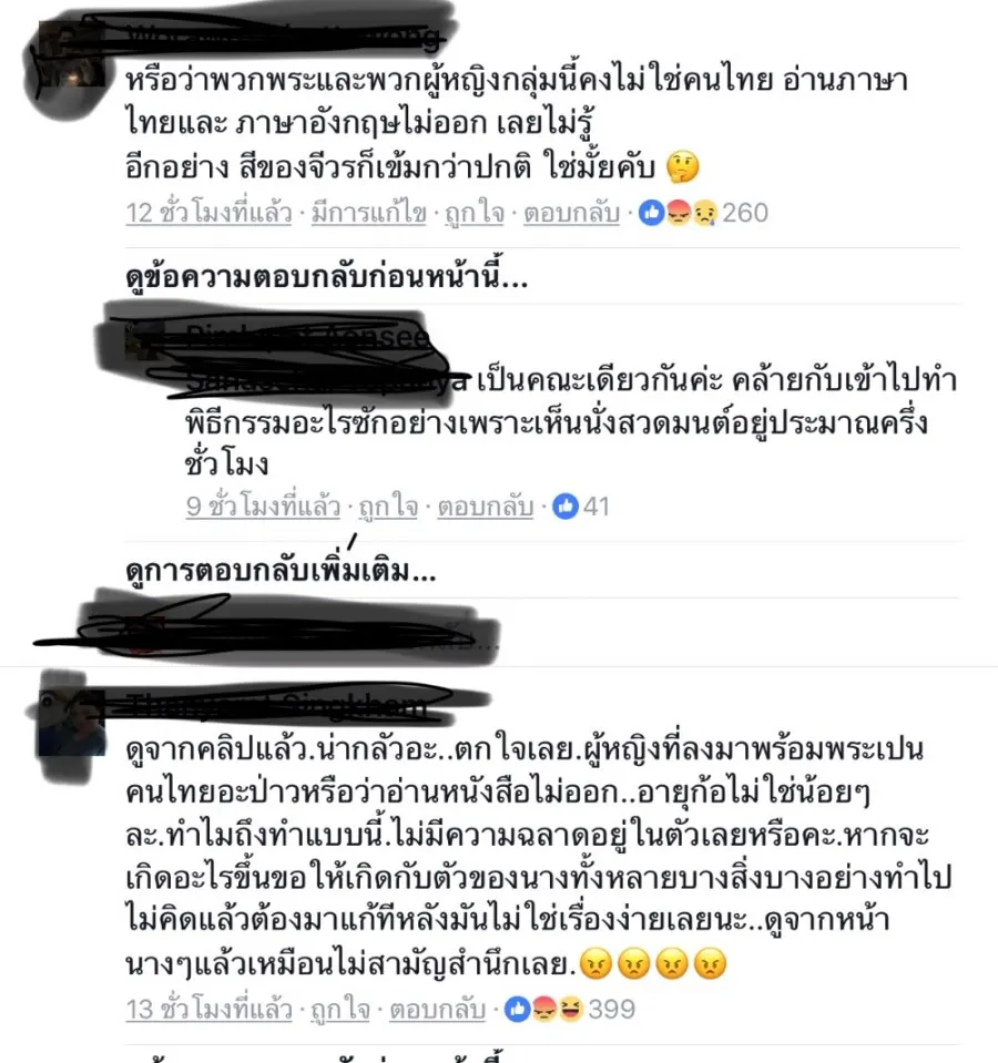 ขนาดชาวต่างชาติยังเคารพและไม่เข้าไป แต่เราคนไทยแท้ๆ ทำไมไม่รักษาจารีตที่ดีงามที่สืบต่อกันมาล่ะคะ กระทั่งเจ้าหน้าที่ที่ดูแลที่วัดเข้าไปยกมือไหว้ขอให้ออกมา ก็ไม่สนใจในคำทัดทาน ป้าๆที่บ้านใกล้วัด คนดูและก็ตะโกนจอให้ออกก็ไม่ออกมา อยู่ในนั้นนั่งสวดมนต์นานสักพักนึง จนคล้ายว่าสิ่งศักดิ์สิงร่างชายวัย 40-50 ปี คุณลุงผู้ดูแล แล้วตะโกนด่าอย่างในคลิป ทั้งคณะจึงเดินออกมา ด้วยใบหน้ายิ้มแย้ม