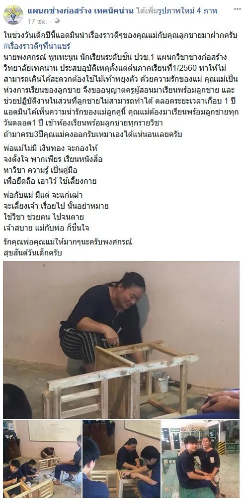10 มกราคม 2561 เฟสบุ๊ค แผนกช่างก่อสร้าง เทคนิคน่าน ได้เผยแพร่เรื่องราวสุดประทับ ความรักของแม่ที่มีต่อลูก ซึ่งลูกชายประสบอุบัติเหตุทำให้เดินไม่สะดวก แต่ด้วยความรักและความเป็นห่วงการเรียนของลูกชาย จึงขออนุญาตครู มาเรียนพร้อมลูกชายเพื่อให้ลูกได้เรียนหนังสือและช่วยเหลือลูกในส่วนที่ลูกยังไม่สามารถทำได้เพราะอาการป่วยยังไม่หายดี โดยเฟสบุ๊ค แผนกช่างก่อสร้าง เทคนิคน่าน ได้เล่าว่า