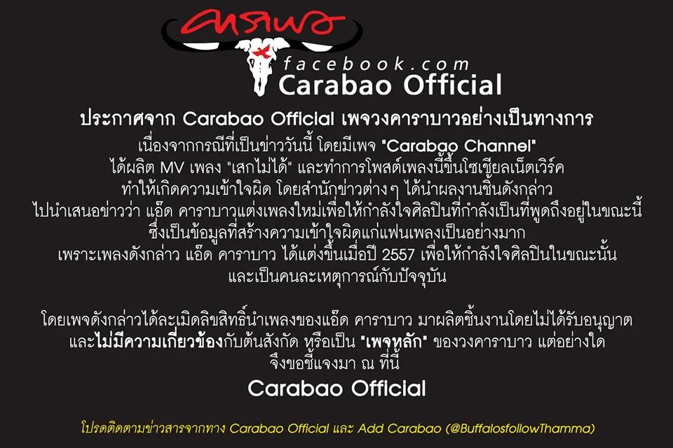 จนทางเพจ Carabao Official ต้องออกมาประกาศเกี่ยวกับกรณีนี้ดังนี้