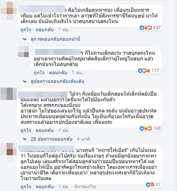 ประเด็นในภาพแรกนี่เห็นบางเพจเขารณรงค์กันโครมๆ ไม่ให้พาลูกหลานไปถ่ายรูปกับทหารและอาวุธที่เอามาโชว์ในวันเด็ก