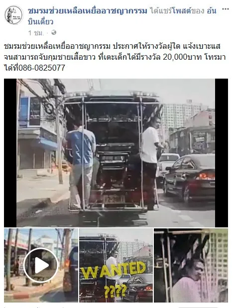 ชมรมช่วยเหลื่อเหยื่ออาชญากรรม ประกาศให้รางวัลผู้ใด แจ้งเบาะแส จนสามารถจับกุมชายเสื้อขาว ที่เตะเด็กได้มีรางวัล 20,000บาท โทรมาได้ที่ 086-0825077