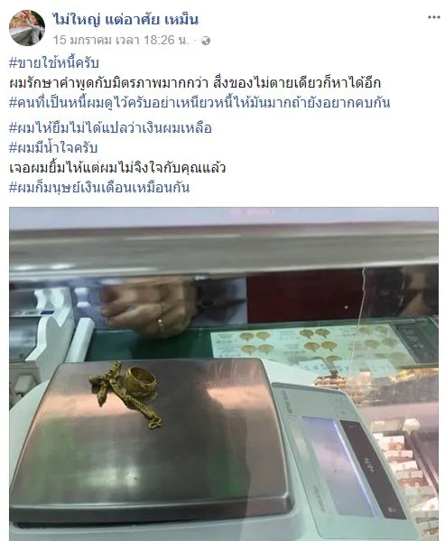 แต่สำหรับหนุ่มคนนี้ ไม่มีคำว่าผิดคำพูด ตัดสินใจเข้าร้านทองเพื่อขายทองใช้หนี้ รักษาคำพูดและมิตรภาพแบบนี้ใครคบเป็นเพื่อนไม่มีการเสียเพื่อนเพราะเงินแน่นอน โดยคุณ "ไม่ใหญ่ แต่อาศัย เหม็น" ได้โพสท์ว่า