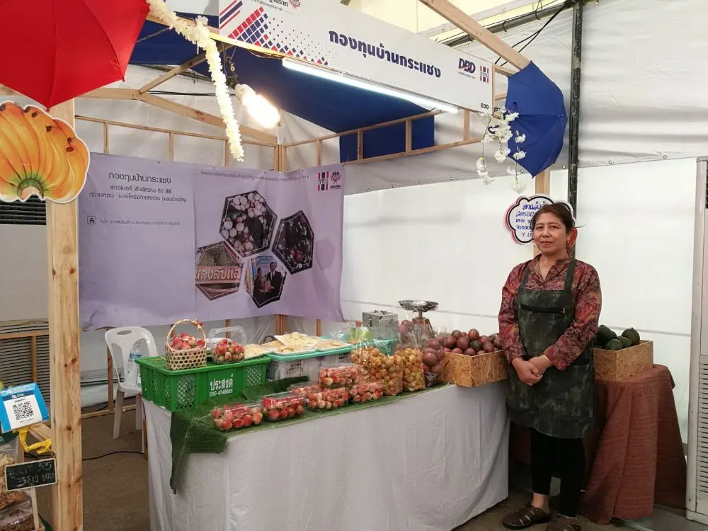 ด้านนางพรทิพย์ พุ่มสำเนียง สมาชิกกองทุนหมู่บ้านกระแซง อ.เมือง จ.ปทุมธานี กล่าวว่า เป็นสมาชิกกองทุนมาเป็น 6-7 ปีแล้ว สินค้าหลักของกลุ่มจะเป็นผลไม้ตามฤดูกาล มีทุเรียน มังคุด ลองกอง รางสาด หน้าหนาวก็จะเป็น สตอเบอรี่ ไรท์เบอรรี่ อโวกาโด เสาวรส ก่อนที่จะเข้ามาร่วมออกร้านค้าในงานแบบนี้ เรามีรายได้แค่วันละพันสองพันบาท พอเข้าร่วมแล้วเราทำให้มีรายได้เพิ่มขึ้นวันละเป็นหมื่น ออกขายนอกพื้นที่ทำให้เราขยายตลาดได้มากขึ้น ลูกค้ารู้จักมากขึ้น บางรายโทรตามเพื่อซื้อสินค้า อย่างมาเปิดร้านที่คลองผดุงก็ได้ลูกค้ามากขึ้น ขายดีมาก เราเป็นกลุ่มที่มีชาวสวนเป็นสมาชิกเยอะ เราก็รับซื้อจากสมาชิกของเรามาขาย เดือนหนึ่งออกร้านแบบนี้สัก 4-5 วัน ก็ทำให้มีรายได้มากขึ้นกว่าแต่ก่อน แล้วเรายังได้ช่วยเพื่อนๆสมาชิกของเราด้วย รายได้ต่อเดือนหักค่าใช้จ่ายก็เยอะกว่าเดิมมาก อยากให้มีการจัดงานได้แบบนี้เรื่อยๆ เพราะไม่ได้แค่เรายังช่วยสมาชิกกองทุนหมู่บ้านคนอื่นด้วย เพราะเพื่อนสมาชิกกองทุนบางรายมีสินค้าจำนวนน้อยก็ไม่พอมาออกร้านก็เอามาให้เราช่วยขายต่อเป็นการช่วยเหลือกันอีกทางหนึ่ง