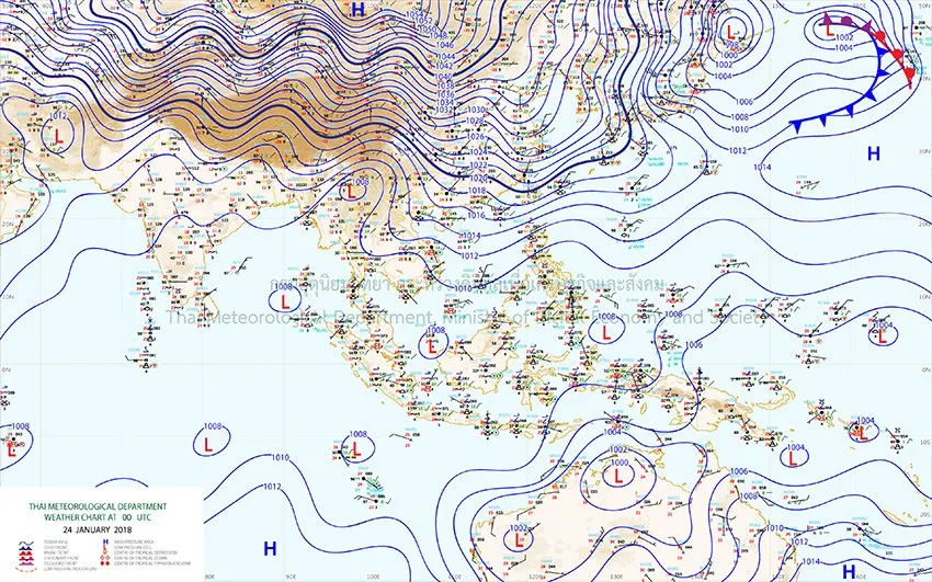 พยากรณ์อากาศ 24 ชั่วโมงข้างหน้า ประเทศไทยตอนบนมีหมอกในตอนเช้าและมีหมอกหนาบางพื้นที่ กับมีฝนฟ้าคะนองบางแห่งบริเวณภาคตะวันออกเฉียงเหนือตอนล่าง ภาคตะวันออก ภาคกลางตอนล่าง รวมทั้งกรุงเทพมหานครและปริมณฑล กับมีฝนหนักบางแห่งในภาคใต้ ขอให้ประชาชนบริเวณประเทศไทยตอนบนเพิ่มความระมัดระวังในการสัญจรผ่านบริเวณที่มีหมอกหนาไว้ด้วย เกษตรกรบริเวณภาคตะวันออกเฉียงเหนือตอนล่าง ภาคตะวันออก และภาคกลางตอนล่าง ระมัดระวังความเสียหายที่อาจเกิดกับผลผลิตเนื่องจากฝนตกไว้ด้วย สำหรับภาคเหนือยังคงมีอากาศหนาวเย็นโดยทั่วไป ส่วนยอดดอยมีน้ำค้างแข็งบางพื้นที่