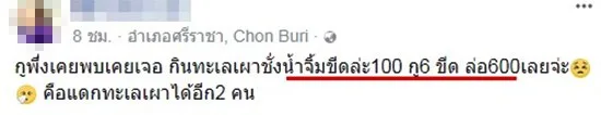 โดยโพสต์ดังกล่าวระบุว่า “เพิ่งเคยพบเคยเจอ กินทะเลเผาชั่งน้ำจิ้มขีดล่ะ 100 กู 6 ขีด ล่อ 600 เลยจ่ะ😣🤧 คือ แดกทะเลเผาได้อีก 2 คน”
