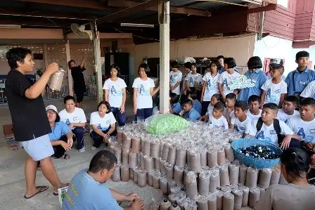นอกจากนี้ พี่ A ยังได้สอนเทคนิคการปลูกผักออร์แกนิค สาธิตตั้งแต่การหว่านเมล็ดพันธุ์การนำต้นกล้ามาปลูกในหลุมเพาะชำโดยใช้ พีทมอส (Peat Moss) เพราะสามารถเก็บความชื้นได้ดี อุ้มน้ำไว้แต่จะไม่อมน้ำจนแฉะ ปราศจากเชื้อสาเหตุโรคพืช ปราศจากวัชพืช เป็นวัสดุที่ไม่เป็นแหล่งสะสมของโรคและแมลง จึงเป็นวัสดุที่เหมาะสำหรับใช้เพาะปลูกต้นกล้า ช่วยเพิ่มเปอร์เซ็นต์การงอก ต้นกล้าสมบูรณ์ แข็งแรง และน้องๆก็ได้ลงมือเพาะต้นกล้าด้วยตนเอง ทั้งยังได้นำกลับไปดูแลต่อที่บ้าน ในช่วงบ่าย เป็นการแข่งขันทำน้ำสมูทตี้เพื่อสุขภาพ โดยแบ่งเป็นทีมให้น้องๆได้มีโอกาสคิดสร้างสรรค์น้ำสมูทตี้ในแบบของตัวเอง ซึ่งบรรยากาศแข่งขันเป็นไปด้วยความสนุกสนานและได้เกร็ดความรู้จากพี่ A ที่คอยแนะนำน้องๆทุกทีม และจบกิจกรรมด้วยการเข้าชมฟาร์มเห็ดนางฟ้าภูฐาน เรียนรู้วิธีการเพาะเห็ดและเข้าชมโรงเรือนเพาะเห็ด พร้อมรับเห็ดสดๆจากฟาร์มเป็นของฝากกลับบ้านให้ชิมกันอีกด้วย