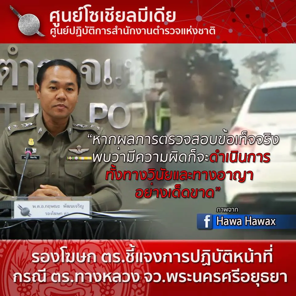 พ.ต.อ.กฤษณะ พัฒนเจริญ รองโฆษก ตร. เปิดเผยถึงกรณีที่มีการเผยแพร่ข้อความและคลิปวีดิโอในโลกโซเชียลมีเดียเกี่ยวกับการปฏิบัติหน้าที่ของ ตำรวจทางหลวงพระนครศรีอยุธยา โดยเบื้องต้นได้รับรายงานจาก สภ.บางปะอิน จว.พระนครศรีอยุธยา ว่า เมื่อวันที่ 28 มกราคม 2561 เวลาประมาณ 15.30 น. บริเวณถนน 347 (ฝั่งมุ่งหน้า อ.บางะหัน) กม.25 ต.เกาะเกิด อ.บางปะอิน จ.พระนครศรีอยุธยา มีอุบัติเหตุรถเฉี่ยวชนกัน พนักงานสอบสวน สภ.บางปะอิน จึงออกตรวจที่เกิดเหตุ พบรถยนต์ จำนวน 3 คันได้รับความเสียหายคือ รถยนต์ส่วนบุคคล 2 คัน และรถยนต์บรรทุก 1 คัน