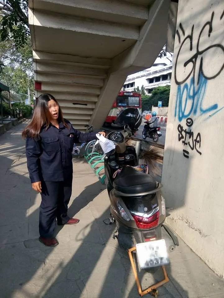 ผู้ใช้เฟซบุ๊กชื่อว่า ศิญารัตน์ สิริสุรีรัตน์ ได้โพสต์เรื่อง พนักงานกวาดขยะโดนใบสั่ง เพราะพบว่าจอดรถจักรยานยนต์กีดขวางทางจราจร ขณะที่ข้อมูลระบุว่า พนักงานคนดังกล่าวนำรถมาจอดตรงจุดนี้เป็นประจำทุกวันเพื่อมาทำงานบริการกวาดถนนบริเวณดังกล่าว หลังจากโพสท์มีคนเข้ามาแสดงความคิดเห็นเป็นจำนวนมาก โดยเธอได้โพสท์ว่า