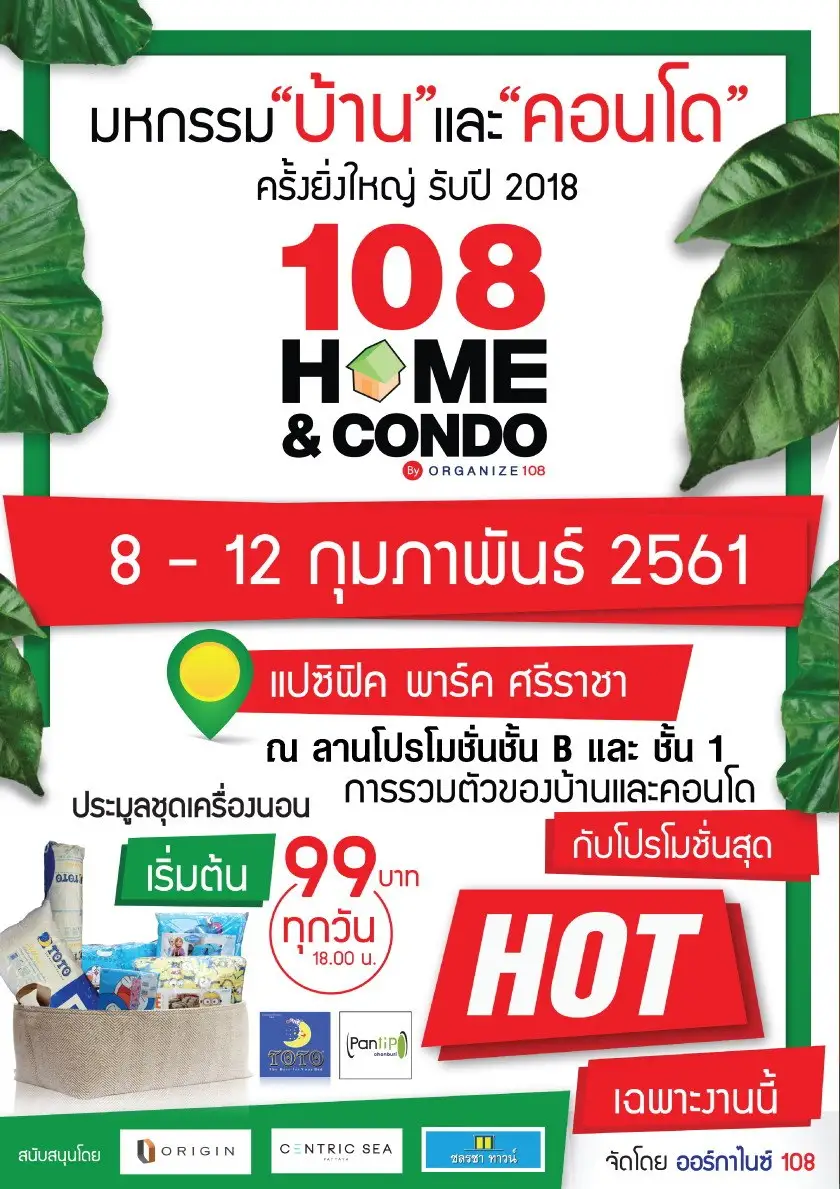 งานมหกรรมบ้านและคอนโด 2018 พบกับโครงการบ้านและคอนโดมิเนียม กับโปรโมชั่นสุด Hot เฉพาะงานนี้พร้อมกิจกรรมการประมูลชุดเครื่องนอน เริ่มต้นที่ 99 บาท ทุกวัน เริ่ม 18.00 น. ระหว่างวันที่ 8 – 12 กุมภาพันธ์ 2561 ณ ลานโปรโมชั่น ชั้น B และลานโปรโมชั่น ชั้น 1 ณ ศูนย์การค้าแปซิฟิค พาร์ค ศรีราชา