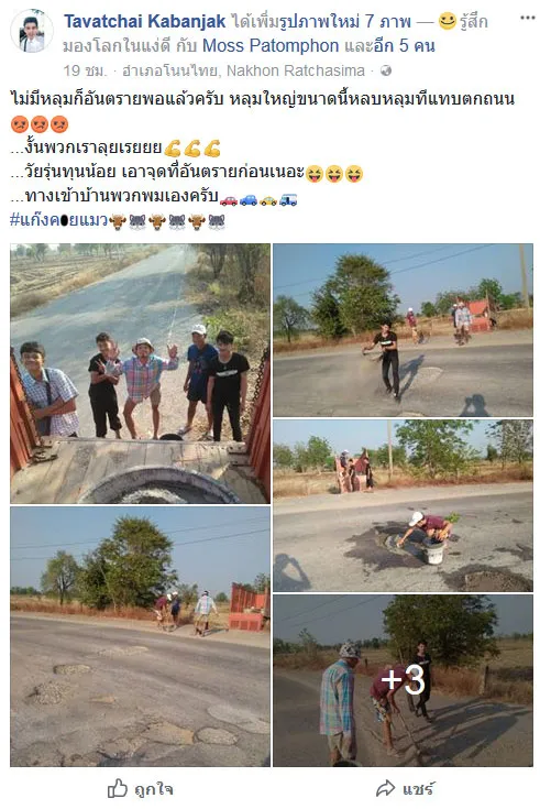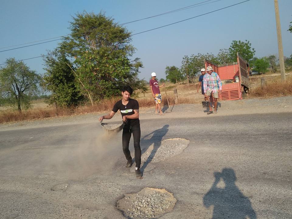 วัยรุ่นรวมกลุ่มกันซ่อมแซมถนนที่เป็นหลุมเป็นบ่อ ที่ อำเภอโนนไทย จังหวัดนครราชสีมา โดยหลังจากที่ได้โพสท์ไปต่างมีชาวเน็ตมาให้กำลังใจชื่นชมเป็นอย่างมาก โดย Tavatchai Kabanjak ได้โพสท์ไว้ว่า