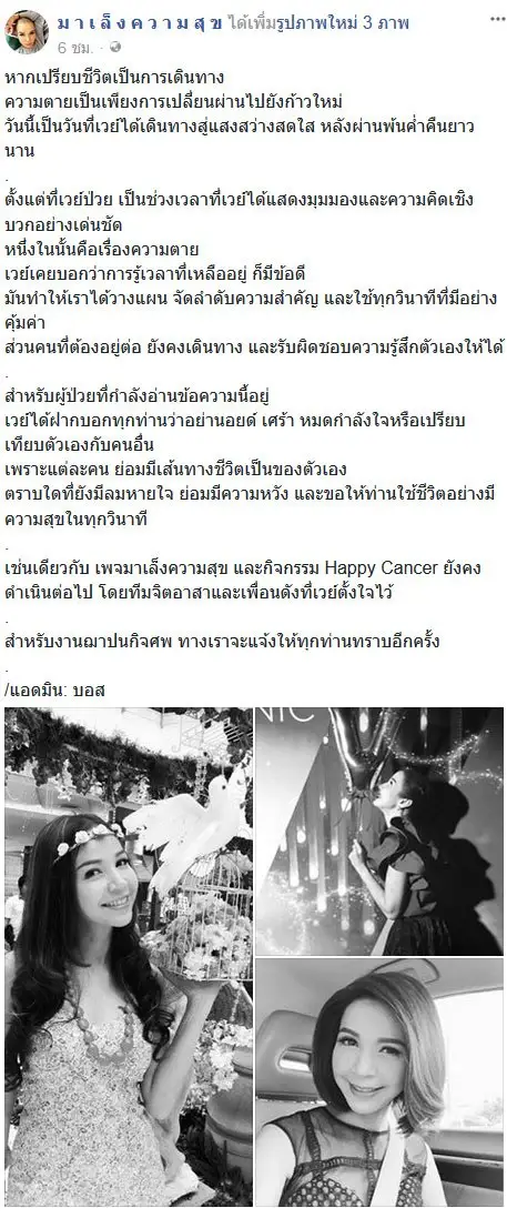 เพราะนอกจากเธอจะเป็นผู้ประกาศข่าวแล้ว ยังเผยแพร่พลังความคิดบวกให้กับผู้ป่วยมะเร็งคนอื่นๆ อีกมากมาย ในเพจ มาเล็งความสุข แม้ตัวเองจะต้องเผชิญกับความเจ็บปวดอยู่ก็ตาม จะเห็นได้จากโพสท์ต่างๆ ที่อยู่ในเพจ มักจะเป็นข้อคิดดีๆ พร้อมกับรอยยิ้มสดใสของเธอ แทบไม่น่าเชื่อว่าวันนี้เธอจะจากไปแล้ว
