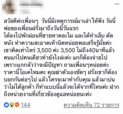 "สวัสดีค่ะเพื่อน ๆ วันนี้มีเหตุการณ์มาเล่าให้ฟัง วันนี้พ่อของเพื่อนฝรั่งมาถึงวันนี้วันแรก ได้ลงไปพักผ่อนที่ชายหาดละไม และได้ทำเล็บ ตัดหนัง ทำความสะอาดเท้านิดหน่อย พอเสร็จรู้มั้ยคะเขาคิดเท่าไหร่ 3,500 ค่ะ 3,500 ไม่ถึง 40 นาที แล้วคนแก่ไปคนเดียวทำยังไงล่ะคะ แกก็ต้องจ่ายไปเพราะแกกลัวว่าจะมีปัญหา ถามเพื่อน ๆ หน่อยค่ะ ราคานี้โอเคไหมคะ คุณฆ่าตัวเองชัด ๆ ฝรั่งเขาก็ต้องบอกกันต่อ ๆ ไป แล้วใครจะมาทำกับคุณ แล้วมาบ่นว่าไม่ได้ลูกค้า ก็ทำแบบนี้แล้วจะได้จากที่ไหนคะ ฝากถึงหน่วยงานที่เกี่ยวข้องดูแลหน่อยนะคะ"