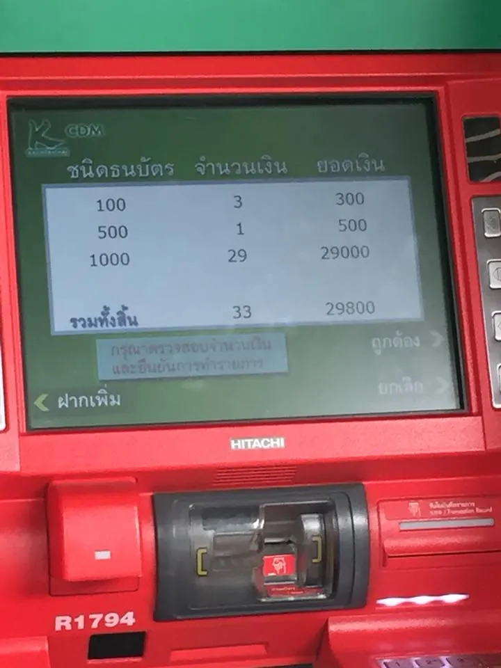 สวัสดีครับ พอดีวันนี้ได้ไปใช้บริการ ATM ธนาคารกสิกรสาขา เดอะไนน์ เซ็นเตอร์ พระราม 9 ช่วงเวลา 08:50 และได้เห็น ตู้ฝากเงิน CDM ที่อยู่ข้างๆ มีการนำฝากเงินจำนวน แบ๊งค์ 100 3 ใบ แบ๊งค์ 500 1 ใบ และ แบ๊งค์ 1,000 29 ใบ รวมยอดเงิน 29,800 บาท โดยหน้าจอค้างอยู่เหมือนยังทำรายการไม่สำเร็จ แต่ตัวเจ้าของไม่อยู่ครับ ผมจึงเรียก พี่ปวิตร ศรีมา (ป้องกันเพลิง) เจ้าหน้าที่ดูแลฝ่ายอาคาร เข้ามาทำการตรวจสอบ ทางด้านเจ้าหน้าที่พยายามประสานเจ้าหน้าที่กสิกร แต่ยังไม่มาทำงาน ผมจึงขออนุญาติถ่ายรูปหน้าจอ เพื่อส่งให้ทางเพจหลายๆเพจในโซเชี่ยว เพื่อประกาศหาเจ้าของเงินที่มาทำรายการฝากเงินที่ธนาคารกสิกรไทยระหว่างเวลา 08:00 - 09:00 ในวันที่ 5 กุมภาพันธ์ 2561