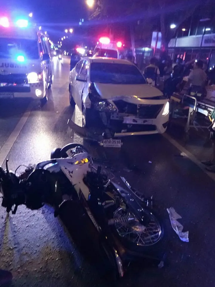 อุบัติเหตุรายวันเมืองไทย!! เก๋งประสานงา มอเตอร์ไซด์ช่วงทางโค้ง มอเตอร์ไซด์สาหัสมีอาการเลือดคลั่งในสมอง