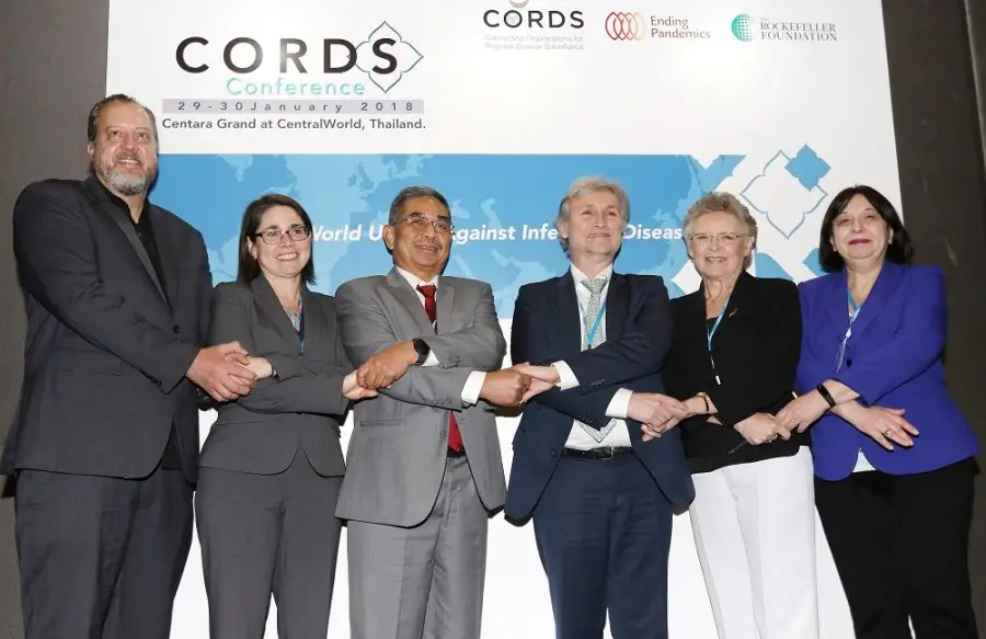 ดร.คริสต้อฟ ลองเก็ต (ที่ 4 จากซ้าย) ผู้อำนวยการฝ่ายบริหารเครือข่ายคอร์ท เป็นประธานการประชุมเครือข่ายคอร์ท (CORDS Conference 2018) เพื่อนำเสนอ และแลกเปลี่ยนประสบการณ์ระหว่างภาคีเครือข่ายของคอร์ท จากภูมิภาคต่าง ๆ ของโลก ในการการป้องกัน ตรวจสอบ และตอบสนองของการระบาดของเชื้อโลก โดยมี ศ.ดร.ฟรองซัวร์ แบร์-ซินนูซิ (ที่ 5 จากซ้าย) ดร.ซิลเวีย บิโน่ (ขวา) ดร.ชาเลน เบิร์ก (ที่ 2 จากซ้าย) ดร.มาร์ก สโมลินสกี้ (ซ้าย) ร่วมงาน เมื่อเร็ว ๆ นี้ ณ ห้องประชุม M1 โรงแรมเซ็นทารา แกรนด์ แอท เซ็นทรัลเวิลด์