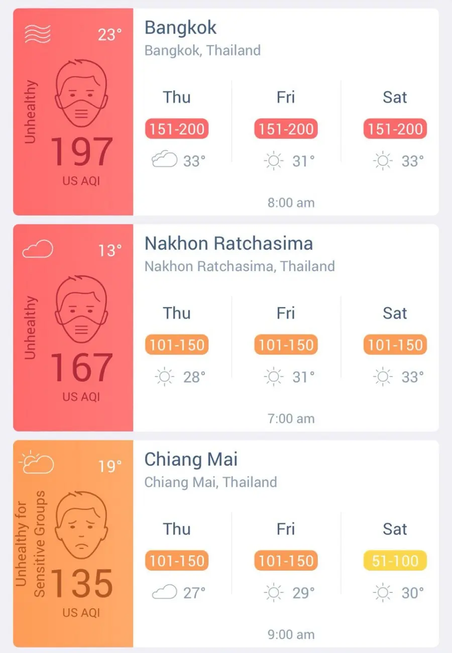 8 กุมภาพันธ์ 2561 เว็บไซต์ aqicn.org รายงานค่า PM2.5 เกิน 50 ซึ่งเป็นค่ามาตราฐานหลายพื้นที่ เช่นในกรุงเทพฯ สูงถึง 203 , ระยอง 150, เชียงใหม่ 135 , นครราชสีมา 167