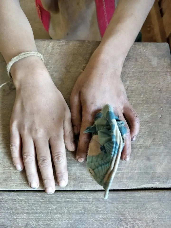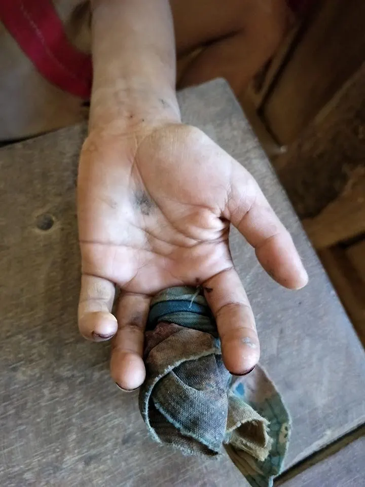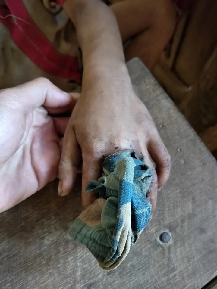 แต่สำหรับเด็กที่นี่ เขาไม่มียา ไม่มีหมอ แม้กระทั้งผ้าปิดแผลก็ไม่มี เลยต้องใช้เศษผ้าเก่าๆ มาปิดไว้แบบนี้แทน กันไม่ให้เศษฝุ่นหรือแมลงเข้าได้ ปิดไว้แบบนี้จนกว่าแผลจะแห้งติดกัน และหายไปเอง
