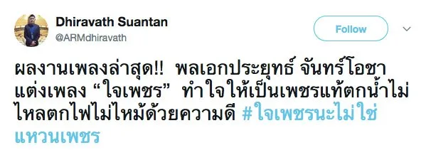 จากเมื่อวันที่ 9 กุมภาพันธ์ 2561 ทวิตเตอร์ @ARMdhiravath ได้โพสท์ผ่านทวิตเตอร์ พล.อ. ประยุทธ์ จันทร์โอชา นายกรัฐมนตรีและหัวหน้าคณะรักษาความสงบแห่งชาติ ได้แต่งเพลง ใจเพชรขึ้น พร้อมระบุว่า