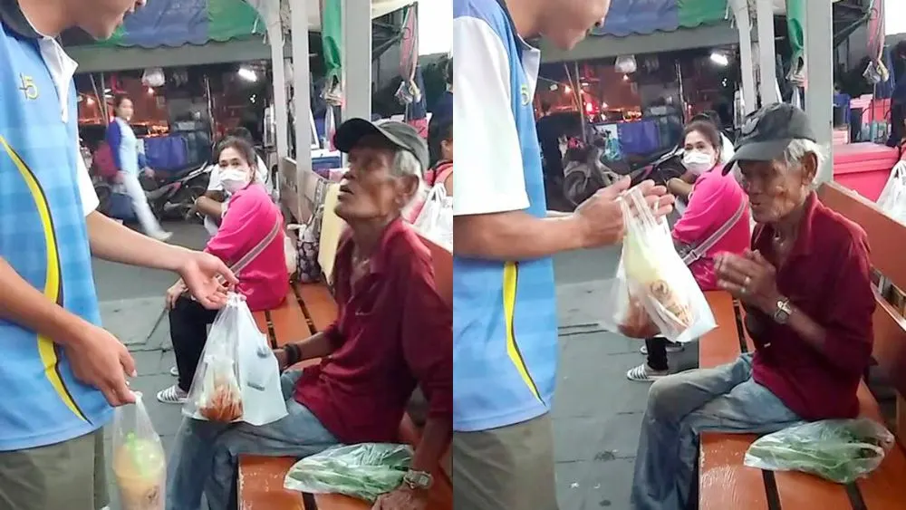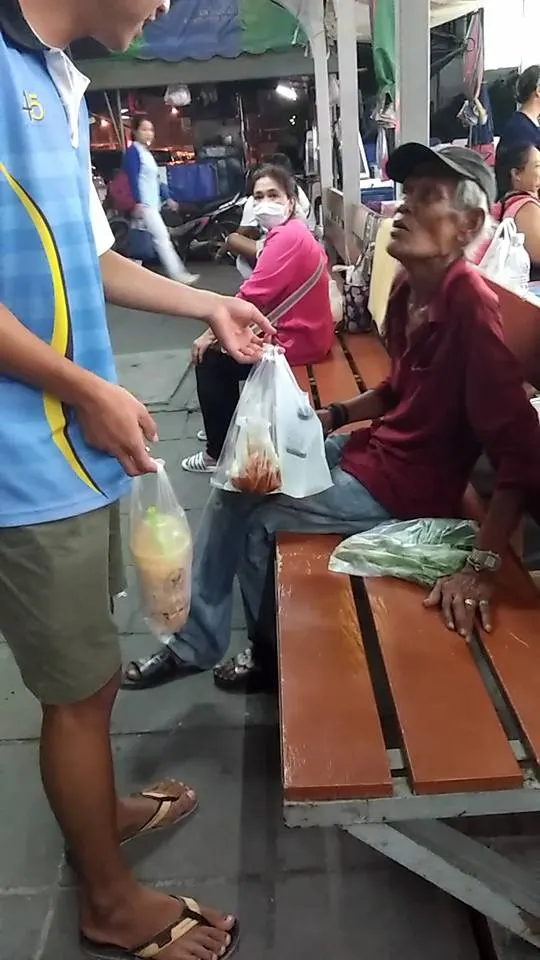 หนุ่มใจดี แบ่งปันน้ำใจให้คนแก่ไม่มีบ้านไม่มีญาติ นั่งอยู่ป้ายรถเมย์คนเดียว