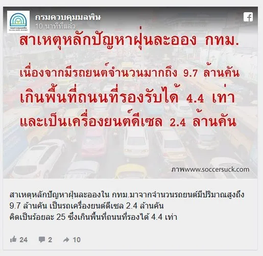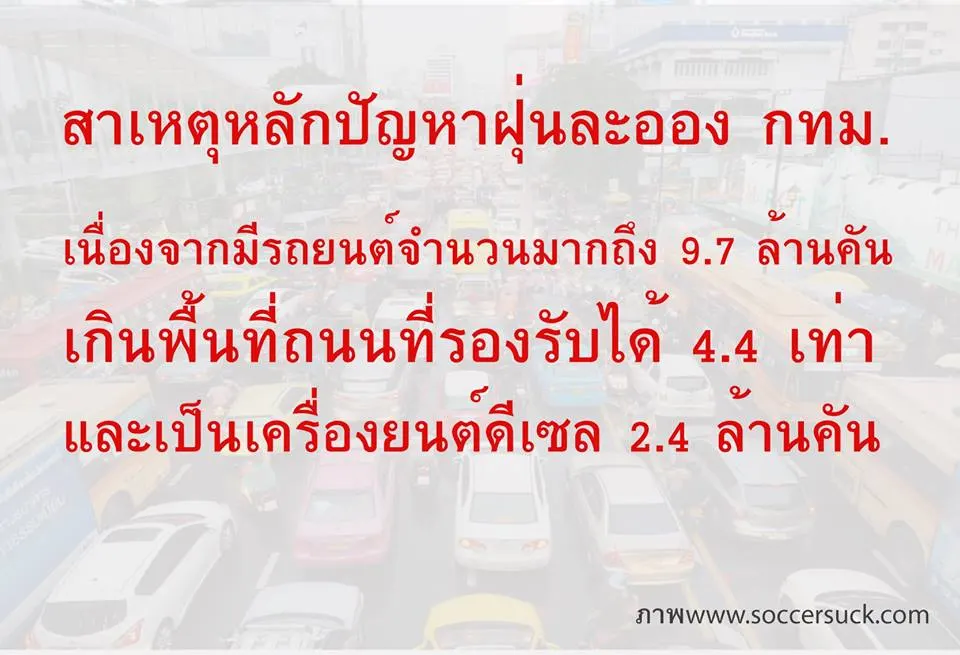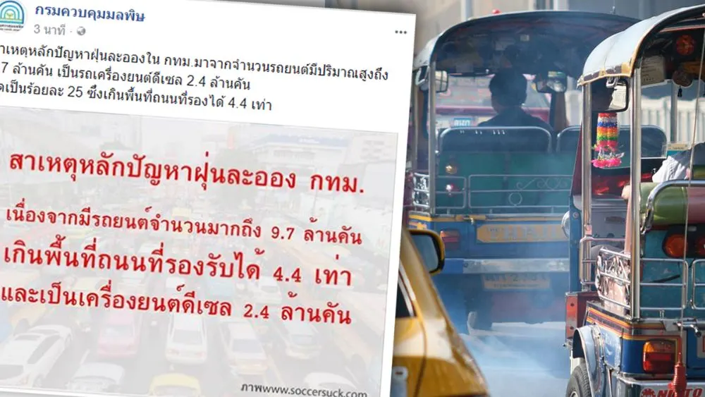 กรมควบคุมมลพิษเผย ปัญหาฝุ่นละอองใน กทม.มาจากจำนวนรถยนต์มีปริมาณสูงถึง 9.7 ล้านคัน