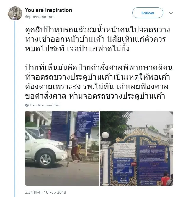 ซึ่งต่อมามีการทวิตข้อความ ว่า “ป้ายที่เห็นมันคือป้ายคำสั่งศาลพิพากษาคดีคนที่จอดรถขวางประตูบ้านเค้าเป็นเหตุให้พ่อเค้าต้องตายเพราะส่ง รพ.ไม่ทัน เค้าเลยฟ้องศาล ขอคำสั่งศาล ห้ามจอดรถขวางประตูบ้านเค้า”
