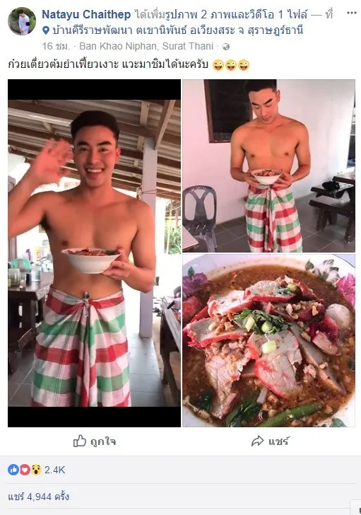 หนุ่มหล่องานดี โพสท์ผ่านเฟซ Natayu Chaithep เชิญชวนมาชิมก๋วยเตี๋ยวถึงที่บ้าน งานนี้ไม่รู้สาวๆอยากกินก๋วยเตี๋ยวหรือกินคนทำกันแน่ เพราะโพสท์ไปไม่ถึงข้ามคืนก็แชร์กันเกือบ 5 พันครั้ง แถมกดไลค์และเม้นท์กันรัวๆ