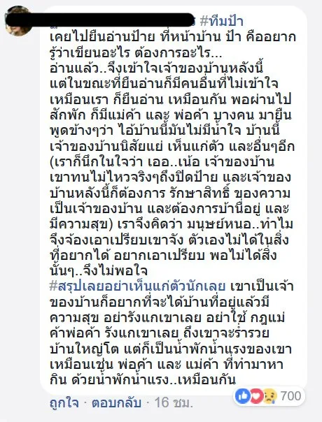 ชาวเน็ตร่วมเม้นต์ประสบการณ์จอดรถหน้าบ้านป้าทุบรถ โดยส่วนใหญ่ชมว่าจริงๆแล้วไม่ได้เป็นคนดุร้ายอะไร แถมยังดูท่าทางใจดี แต่ที่เห็นในข่าวอาจจะเหลืออดจริงๆ เพราะต้องทนอยู่ในสภาพนี้ถึงเกือบ 10 ปี โดยทางเพจ เดี๋ยวเจ๊เต่าจะเล่าให้ฟัง ได้นำความคิดเห็นจากผู้ใช้เพซบุ๊คมาให้อ่านกันว่า