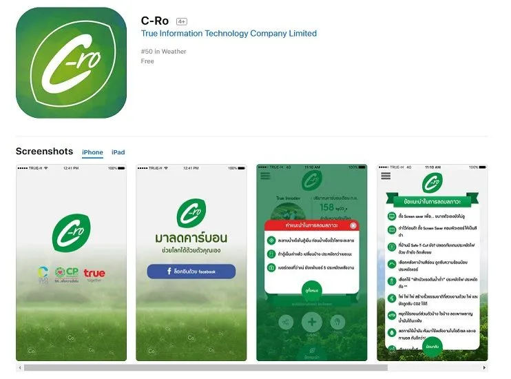 และหากใครอยากกลับมาสำรวจพฤติกรรมตัวเองว่า ในชีวิตประจำวันของเราสามารถช่วยโลกลดการปล่อยก๊าซเรือนกระจกได้เท่าไหร่ เรามีแอพพิเคชั่นดีๆมาแนะนำ ชื่อว่า C-ro Application ซึ่งเป็นนวัตกรรมสีเขียวที่ช่วยรณรงค์การลดการปล่อยคาร์บอน โดยทำการประมวลผลตามพฤติกรรมการใช้ชีวิตประจำวันของเรา โดยแอพพิเคชั่นนี้ได้รับรางวัลการันตรี เหรียญทองแดง (Bronze Medal) จากสมาคมส่งเสริมนักคิดค้นสิ่งประดิษฐ์และนวัตกรแห่งประเทศอังกฤษ (The Association of British Inventors and Innovators) ซึ่งสร้างสรรค์โดยกลุ่มทรู ร่วมกับองค์การก๊าซเรือนกระจกแห่งประเทศไทย และเครือเจริญโภคภัณฑ์ เป้าหมายเพื่อรณรงค์ให้ประชาชนทั่วไปร่วมเป็นส่วนหนึ่งในการลดการปล่อยคาร์บอน