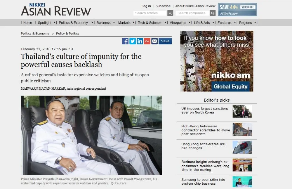 วารสาร “นิเคอิ เอเชียน รีวิว” ได้นำเสนอรายงานพิเศษเกี่ยวกับกรณีที่พลเอกประวิตร วงษ์สุวรรณ รองนายกรัฐมนตรีและรัฐมนตรีกลาโหมถูกพบว่าครอบครองนาฬิกหรูมากกว่า 25 เรือน มูลค่ากว่า 1 ล้านดอลลาร์ ถึงแม้สังคมจะรับไม่ได้ แต่ก็ยังไร้ความรับผิดชอบจากผู้มากบารมีในรัฐบาลไทย