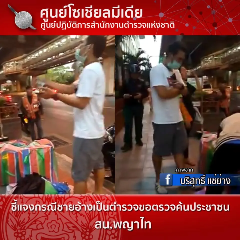 ศูนย์โซเชียลมีเดีย ขอชี้แจงกรณีผู้ใช้เฟสบุ๊คชื่อ "บริสุทธิ์ แซ่ย่าง" ได้โพสต์คลิปพร้อมภาพ ชายอ้างตัวว่าเป็นเจ้าหน้าที่ตำรวจ ขอตรวจค้นประชาชนบริเวด้านหน้าโรงพยาบาลรามาธิบดี จากการประสานข้อมูลกับทาง พ.ต.อ.นิติวัฒน์ แสนสิ่ง ผกก.สน.พญาไท ได้รับการชี้แจงข้อมูลดังนี้