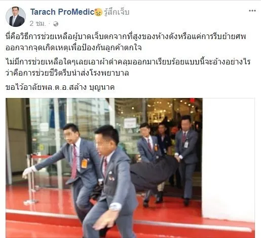 โลกออนไลน์มีการแชร์ภาพระหว่างเคลื่อนย้ายร่าง พล.ต.อ.สล้าง โดยพบว่า พล.ต.อ.ถูกผ้าสีดำคลุมไว้ระหว่างเคลื่อนย้าย พร้อมกับนำร่างขึ้นรถกระบะออกจากพื้นที่อย่างรวดเร็ว ซึ่งมีการตั้งคำถามว่า เป็นการช่วยอย่างถูกวิธีหรือไม่ หรือเพียงแค่รีบเคลืื่อนย้ายเพื่อไม่ให้ลูกค้าตกใจ โดยไม่คำนึงถึงความปลอดภัยหากยังไม่เสียชีวิตหรือไม่