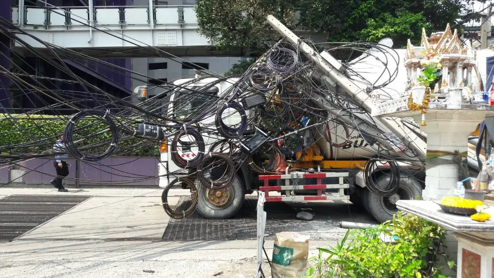 ดูแล้วยุ่งเหยิง สายไฟไทย !! รถโม่ปูนเกี่ยวสายสื่อสารเสาไฟฟ้าล้มทับ