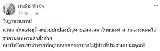 ในฐานะแพทย์ แว่นตากันแสงยูวี จะช่วยปกป้องปัญหาของดวงตาในขณะทำงานกลางแดดได้ รบกวนทบทวนคำสั่งด้วย อย่าให้ใครเขาว่าพวกที่อยู่บนหอคอยงาช้างไม่รู้ประสีประสาเลยนะคุณพี่...