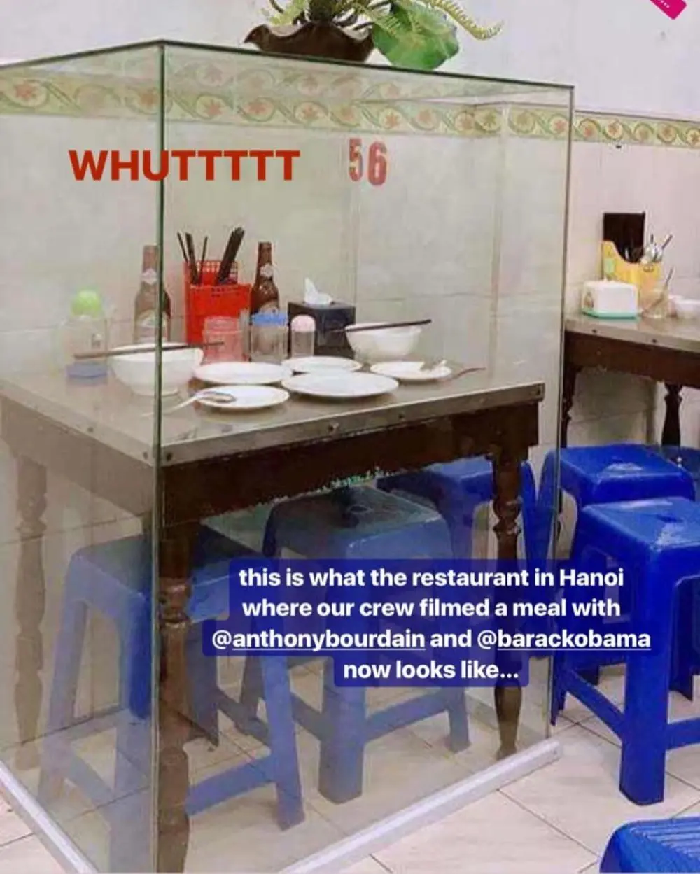 13 มี.ค. 2561 แอนโธนี เบอร์เดน เชฟชื่อดังชาวอเมริกัน โพสต์ IG ภาพโต๊ะในร้านอาหารที่กรุงฮานอยที่ตนเองและนายบารัก โอบามา ประธานาธิบดีสหรัฐอเมริกาคนก่อน เคยไปนั่งกินอาหารด้วยกัน เมื่อปี 2559 ว่าตอนนี้ทางร้านนำกระจกมาครอบไว้เพื่อโชว์แขกในร้านว่าครั้งหนึ่งผู้นำสหรัฐเคยนั่งมาแล้ว