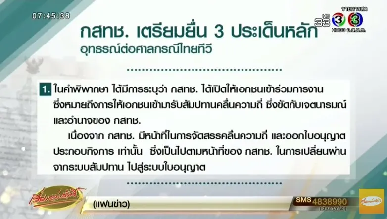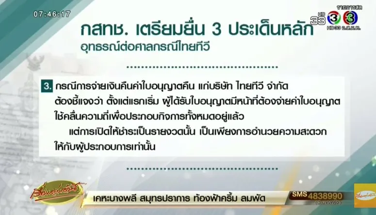 3.กรณีการจ่ายเงินคืนค่าใบอนุญาตคืน แก่บริษัท ไทยทีวี จำกัด นั้น ต้องชี้แจงว่า ตั้งแต่แรกเริ่ม ผู้ได้รับใบอนุญาตมีหน้าที่ต้องจ่ายค่าใบอนุญาตใช้คลื่นความถี่เพื่อประกอบกิจการทั้งหมดอยู่แล้ว แต่การเปิดให้ชำระเป็นรายงวดนั้น เป็นเพียงการอำนวยความสะดวกให้กับผู้ประกอบการเท่านั้น ทั้งนี้จะเป็นหน้าที่ของฝ่ายกฎหมาย กสทช. ในการเตรียมเอกสารหลักฐานเพิ่มเติมเพื่อทำการยื่นอุทธรณ์ ตามกรอบเวลา 30 วัน อย่างไรก็ตามมองว่า