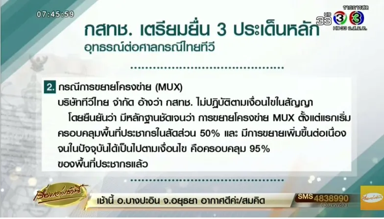 2. กรณีการขยายโครงข่าย(MUX) ที่บริษัททีวีไทย จำกัด อ้างว่า กสทช. ไม่ปฏิบัติตามเงื่อนไขในสัญญา โดยยืนยันว่า มีหลักฐานชัดเจนว่า การขยายโครงข่าย MUX ตั้งแต่แรกเริ่มครอบคลุมพื้นที่ประชากรในสัดส่วน 50% และ มีการขยายเพิ่มขึ้นต่อเนื่องจนในปัจจุบันได้เป็นไปตามเงื่อนไข คือครอบคลุม 95% ของพื้นที่ประชากรแล้ว