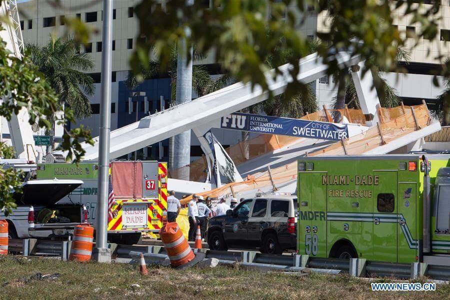 เกิดเหตุสะพานลอยสร้างใหม่ ใกล้กับมหาวิทยาลัยนานาชาติฟลอริดา (FIU) เมืองไมอามี รัฐฟลอริดา สหรัฐอเมริกา พังถล่มลงกลางถนนหลวงในช่วงเวลาราว 13.30 น. ตามเวลาท้องถิ่นวันพฤหัสบดี (15 มี.ค.) ทับรถยนต์อย่างน้อย 8 คัน ส่งผลให้มีผู้เสียชีวิตแล้ว 4 ราย และผู้บาดเจ็บ 9 ราย