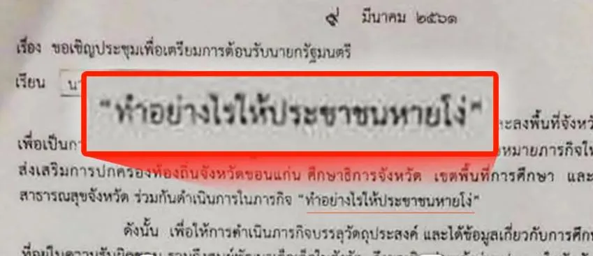 โดยเนื้อหาในหนังสือดังกล่าวมีข้อความส่วนหนึ่งระบุว่าร่วมกันดำเนินการในภารกิจ “ทำอย่างไรให้ประชาชนหายโง่”นายสุชัย บุตรสาระ รอง ผวจ.ขอนแก่น กล่าวว่า หนังสือดังกล่าวเป็นของจริง และได้ทำการแก้ไขหนังสือดังกล่าวแล้วโดยเป็นหนังสือที่อ้างถึง หนังสือเลขที่ 0023.1/7063 ลงนามเมื่อวันที่ 12 มี.ค. 2561 เนื้อหาหนังสือฉบับนี้ระบุว่า ตามที่จังหวัดขอนแก่น ได้แจ้งเชิญประชุมเตรียมการต้อนรับนายกรัฐมนตรี ในวันที่ 13 มี.ค. 2561 ณ ห้องประชุมศรีบริรักษ์ ชั้น 5 ศาลากลางจังหวัดขอนแก่น โดยจังหวัดขอนแก่น ศึกษาธิการจังหวัด เขตพื้นที่การศึกษา และสำนักงานสาธารณสุข ร่วมกันดำเนินการในภาพกิจด้านการศึกษาต้องขออภัยประชาชนทุกคน ที่ทำให้เข้าใจผิด