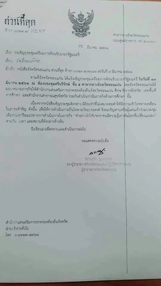 คืบหน้ากรณีที่มีการแชร์ในสังคมออนไลน์ เกี่ยวกับเอกสารราชการ ซึ่งเป็นหนังสือเชิญประชุมที่ออกโดยสำนักงานส่งเสริมการปกครองท้องถิ่นจังหวัดขอนแก่น เลขที่ ขก.0023.1/7063 เรื่อง ขอเชิญประชุมเพื่อเตรียมการต้อนรับนายกรัฐมนตรี ลงนามโดย นายสุชัย บุตรสาระ รอง ผวจ.ขอนแก่น ปฏิบัติราชการแทน ผวจ.ขอนแก่น ลงนามเมื่อวันที่ 9 มี.ค. 2561