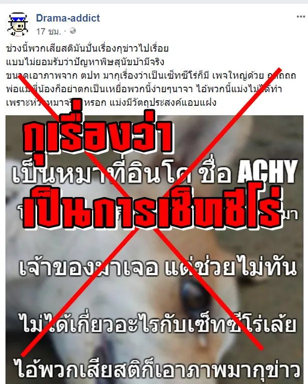 สร้างข่าวหมาๆ!! เพจ Drama-addict แฉมีบางเพจ นำภาพหมาโดนวางยาในอินโดฯ มาโยงเหตุการณ์ โรคพิษสุนัขบ้าระบาด และ Set Zero ในไทย