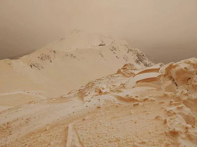 นักสกีและนักท่องเที่ยวจำนวนมากต่างพากันแชร์ภาพที่น่าอัศจรรย์ หลังจากที่หิมะสีขาวโพลนกลายเป็นสีส้ม ราวกับภูมิทัศน์บนดาวอังคาร หิมะที่เปลี่ยนสีส้ม เกิดจากอิทธิของพายุที่จากเคลื่อนตัวมาจากทางตอนเหนือของแอฟริกา ที่หอบฝุ่นและทราย มาจากทะเลทราย”ซาฮารา” เข้าปกคลุมจึงทำให้หิมะใรสกีรีสอร์ทหลายแห่งทั้งในรัสเซียและโรมาเนียกลายเปลี่ยนเป็นสี