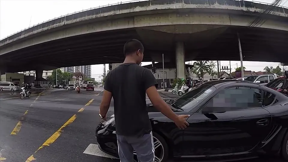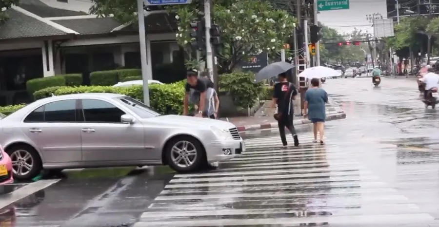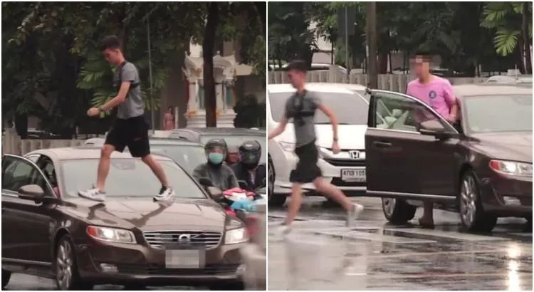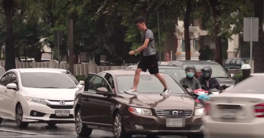 หลายๆคนบอกว่าพวกที่ไม่เคารพกฎจราจรก็ต้องเจออะไรแบบนี้ อย่างในคลิปนี้ที่ผู้คนมากมายเดินข้ามทางม้าลาย แต่มีบางช่วงที่มีพวกมักง่ายจอดรถติดไฟแดงเกินเส้นหยุด เลยมาเหยียบถึงบนทางม้าเลย จึงมีสองหนุ่มแก้เผ็ดพวกนี้โดยการเดินเหยียบขึ้นไปบนฝากระโปรงรถ ที่จอดล้ำมาถึงทางม้าเลย โดยผู้โพสต์ระบุข้อความไว้ว่า