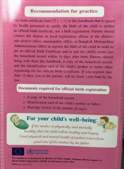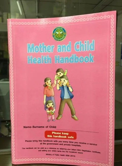 ในภาพนี่เป็นสมุดฝากครรภ์ แม่ที่ตั้งท้องปรกติจะได้สมุดเล่มนี้ ข้างในจะมีบันทึกทุกอย่างเกี่ยวกับทั้งแม่และเด็กเอาไว้ ตั้งแต่ประวัติการฝากครรภ์ การฉีดวัคซีน โภชนาการเด็ก ควรป้อนอาหารอะไรให้ลูก แม่ควรบำรุงร่างกายยังไงทั้งตอนตั้งครรภ์ ตอนให้นม บลาๆ