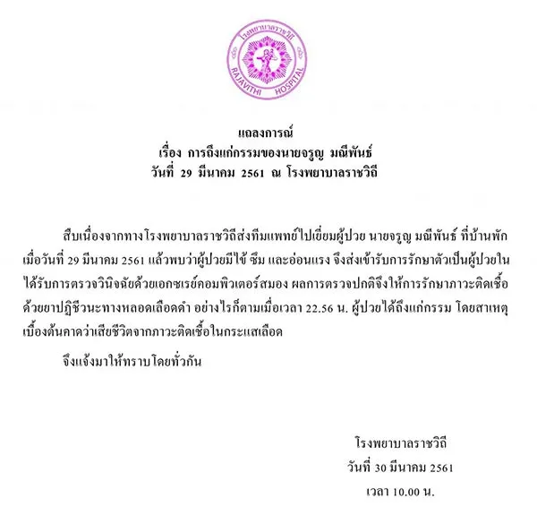 ส่วนคุณวนิดา มณีพันธ์ ลูกสาวคุณตาจรูญ เปิดเผยว่า พ่อเสียชีวิตตอน 3 ทุ่ม หลังมีอาการช็อก ซึ่งทีมแพทย์ได้พยายามช่วยอย่างสุดความสามารถแล้ว ตอนนี้ทุกคนในครอบครัวยังทำใจไม่ได้ เพราะก่อนเกิดเรื่องพ่อก็แข็งแรง ขี่รถซาเล้งได้ปกติ