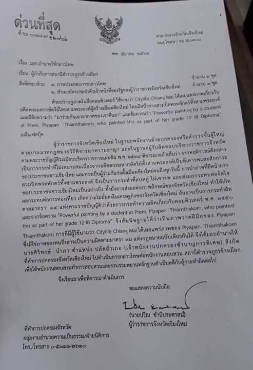จากกรณี ในสื่อโซเชียล ผู้ใช้ชื่อว่า “City Life Chiang Mai” ได้เผยแพร่ภาพวาด พญามังราย พญางำเมือง และพ่อขุนรามคำแหงมหาราช อดีตพระมหากษัตริย์ไทย 3 พระองค์ผู้สร้างเมืองเชียงใหม่ โดยมีหน้ากากสวมปิดพระพักตร์ทั้ง 3 พระองค์ และมีข้อความเป็นภาษาไทยว่า “มาร่วมกันเอาอากาศของเราคืนมา" และข้อความเป็นภาษาอังกฤษว่า “Powerful painting by student at Prem,Piyapan Thiamthakorn,who pained this as part of grade 12 IB Diploma” ลงในเฟซบุ๊ก